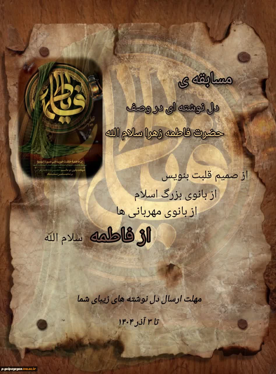 امتیاز دهید : مسابقه دانشجویی دل نوشته ای زیبا در وصف حضرت فاطمه زهرا سلام الله 2 دوشنبه 26 آبان 1404 ساعت 14:24