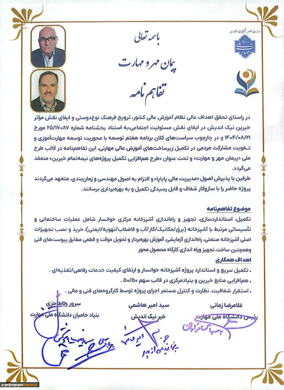 امتیاز دهید : امضای تفاهمنامه ساخت خوابگاه، زمینهای ورزشی و محوطه مجتمع آموزشی گلپایگان در چارچوب «پیمان مهر و مهارت» 2 سهشنبه 21 بهمن 1404 ساعت 10:33